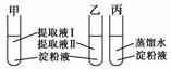 [解析] 本题考查的知识点包括温度对生命活动的影响、酶的特性等,并考查了可溶性还原糖的鉴定实验,属于中等难度题。20 ℃培养箱中培养4天的萌发种子不如30 ℃培养箱中培养4天的萌发种子的生命活动旺盛,故提取液Ⅰ中的淀粉酶浓度比提取液Ⅱ中的淀粉酶的浓度低,试管甲中产生的麦芽糖较少,砖红色较浅。丙内无淀粉酶,淀粉未被分解,没有产生麦芽糖,斐林试剂本身呈蓝色。
