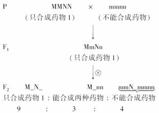(2)F1自交产生的F2中三种表现型之比为9∶3∶4应为9∶3∶3∶1的变形,仍符合基因自由组合定律,只有mmN_与mmnn均表现“不能合成药物”而已,由题意知只有M与nn同时存在时才会合成两种药物。遗传图解的写法应与通常状况下的两对相对性状遗传一致。