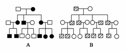 [解析] 本题考查遗传系谱图的分析,为容易题。A图表现为女性患者的后代全部患病,正常女性的后代全部正常,故最可能为细胞质遗传;B图表现为男性患者的子孙全部患病,正常男性的后代全部正常,故最可能为伴Y遗传。