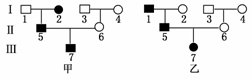 [解析] 本题考查伴X染色体隐性遗传的特点,本题难度中等。甲系谱中7号(男孩患者)的色盲基因只能来自于其母亲(6号),而6号的致病基因只能来自于其母亲(4号),因为其父亲正常。乙系谱中的7号(女性患者)的致病基因来自于其父亲(5号)和母亲(6号),而5号的色盲基因来自于2号,6号的色盲基因只能来自于4号。