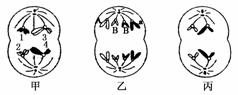 [解析] 根据题干中甲、乙、丙是同一个二倍体的几个细胞分裂图。甲图中同源染色体正在分开,是减数第一次分裂的特征;乙图中着丝点分开,而且有同源染色体,是有丝分裂的特征;丙图中着丝点正在分开,而且没有同源染色体,是减数第二次分裂的特征。由于基因重组发生在减数分裂过程中,所以乙细胞不可能进行基因重组。1与2的片段交换,属于同源染色体的非姐妹染色单体交叉互换,属于基因重组;1与4的片段交换,属于非同源染色体的交换,会改变染色体上基因的数目和排列顺序,属于染色体结构变异。