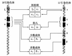 13.(30分)(2009·哈尔滨模拟)控制人的血红蛋白基因分别位于人的11号、16号染色体上,在不同的发育时期至少有α、β、γ、ε、δ和ξ基因为之编码。人的血红蛋白由四条肽链组成,在人的不同发育时期,血红蛋白分子的组成是不相同的。例如人的胚胎血红蛋白由两个ξ肽链(用ξ2表示)和两个ε肽链(用ε2表示)组成。