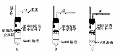 (6)在下图密闭装置中,分别放入质量相等的消毒且刚萌发的小麦种子、刚萌发的小麦种子及刚萌发的花生种子,把三套装置放在隔热的且适宜条件下培养,A和B玻璃管中的水珠开始移动时速率分别为vA和vB,则vA________vB(填>、<、=);如果B和C中都消耗了等质量的有机物,温度计读数为TC________TB(填>、<、=)。