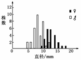 [解析] 由图示可看出雄性个体的直径主要为8-10cm左右,雌性个体的直径主要为11-15cm左右,结合图示可以推测出该植物在生长发育的早期为雄性,生长到一定阶段时会发生性别的转换而成为雌性。这种性别转换的表现形式肯定是由基因控制的,与环境有关,但无法确定其性别决定的类型。雄性植株数量较多有可能是因为个体小或其他原因,但不能确定。