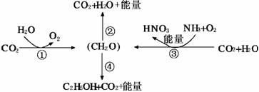 [解析] 本题考查生物的光合作用,呼吸作用和化能合成作用,本题难度中等。图中1过程为光合作用,2过程为有氧呼吸,3过程为化能合成作用(硝化作用),4过程为无氧呼吸。噬菌体无独立代谢能力,不能进行图中任何过程;进行硝化作用的为硝化细菌,为原核生物,在生态系统中为生产者;蓝藻无叶绿体等复杂细胞器,但也能进行光合作用。植物(酵母菌)有氧时细胞进行有氧呼吸,无氧时,细胞可进行无氧呼吸产生酒精。本题易错在于认为噬菌体能进行代谢活动,因为新陈代谢是生物最基本的特征,是生物与非生物最本质的区别。