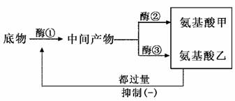 [解析] 这是一道将反馈调节机制与微生物的代谢联系起来的综合性测试题,重点考查学生分析问题的能力。根据题干中所给的条件,利用某种微生物来大量合成氨基酸甲,而某种微生物在某代谢过程中能同时合成两种氨基酸,根据题目的条件,这两种氨基酸需同时过量时才能对酶①产生反馈抑制作用。提高氨基酸的产量必须减小其反馈抑制作用。只要有一种氨基酸不过量,对酶①就没有抑制作用。如果这个代谢过程中只产生氨基酸甲,不产生氨基酸乙,也不会对酶①产生抑制作用。只要想办法将酶①抑制去掉,或通过诱变育种、基因工程的手段,使控制合成酶③的基因发生改变,不能正常合成酶③,就不能合成氨基酸乙,也就不会对酶①产生反馈抑制了。