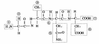 [解析] 本题解答时关键是识别多肽链断裂的位置,即可找到丙氨酸,丙氨酸位置在8、18、27、39,前3个丙氨酸居于肽链中间,切断时需水解掉3×2个肽键,39号丙氨酸只需水解掉1个肽键即可,故共减少7个肽键。