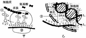 解析:密码子是指mRNA上决定1个氨基酸的3个相邻的碱基;由图可知,甲图表示翻译过程,乙图表示转录过程,在转录和翻译过程中都有碱基互补配对发生;L1、L2共同构成DNA的双螺旋结构。