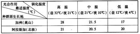 1.将采自加州和阿拉斯加的肾叶山蓼种子在相同环境中培养4个月,任其萌发和生长。然后分成三组分别在不同温度条件下培养,研究驯化温度对不同地区肾叶山蓼光合作用最适温度的影响。生长5-6个月后,测定光合作用最适温度,实验结果见下表。有关推测不能成立的是