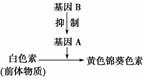解析:由于“显性基因B存在时可抑制A表达”,则亲代AABB(白色)×aabb(白色),F1为AaBb(白色),F1 自交得F2,9A_B_(白色)∶3A_bb(黄色)∶3aaB_(白色)∶1aabb(白色)。F2中总共9种基因型,黄色植株的基因型是AAbb或Aabb,则白色个体的基因型种类是7种。