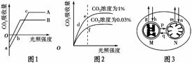 7.(2010·福建南安等三校联考)图1表示A、B两种植物光合作用效率随光照强度改变的变化曲线;图2表示将A植物放在不同浓度CO 2)环境条件下,光合效率受光照强度影响的变化曲线;图3代表阳生植物的一个叶肉细胞及其相关生理过程示意图。请据图回答: