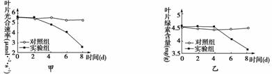 解析:由题中图示曲线信息可知,实验条件下,随干旱时间的延长叶片的光合速率呈下降趋势;对比甲、乙图示可知,叶片光合速率下降先于叶片叶绿素含量下降;由于2-4天光合速率下降早于叶绿素含量下降,因此,光合速率的下降不是叶绿素含量下降引起的;实验条件下,随时间推移,植物缺水严重、叶片失水、气孔关闭,导致CO2 吸收减少,使光合速率下降。