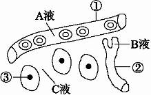 解析:①指的是毛细血管壁细胞,所处的内环境是血浆和组织液,②是毛细淋巴管壁细胞,所处的内环境是淋巴和组织液;人体摄入的营养物质(如蛋白质)过少,会使A液减少C液增加;③的有氧呼吸产物(二氧化碳)可参与体液调节,使呼吸作用加快、加强;丙酮酸的分解发生在细胞以内,且不会直接产生水。