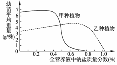 16. (12分)将发芽率相同的甲、乙两种植物的种子,分别种在含有不同浓度(质量分数)钠盐的全营养液中,并用珍珠砂通气、吸水和固定种子。种子萌发一段时间后,测定幼苗平均重 量,结果如下图。