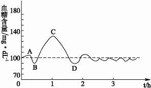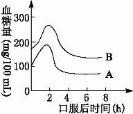 (1)由图可知,A血糖浓度最低值80 mg·dL-1,B血糖浓度最低值160 mg·dL-1。根据正常人血糖浓度最低值80 nag·dL-1,糖尿病人血糖浓度最低值160 mg·dL-1的数据判断,A为正常人,B为糖尿病人。