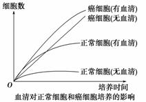 解析:从题图中曲线可看出培养基中有无血清对癌细胞的培养影响不大,二者在细胞数曲线上差不多。正常细胞的培养过程中有无血清所获得的细胞数差距较大,有血清的培养基在相同时间内培养得到的细胞数远远多于无血清的培养基所获得的细胞数。癌细胞培养与正常细胞培养二者的差距比较大,正常细胞达到一定的数目后不再增加,而癌细胞却能不断增加。