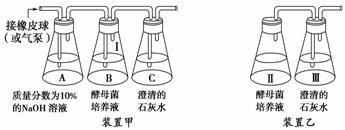 解析:黑暗或光照对酵母菌的细胞呼吸没有明显的影响;装置乙中酵母菌产生的CO2可通过导管进入Ⅲ,但酵母菌产生的酒精保留在Ⅱ瓶中;装置甲中NaOH的作用是使进入B瓶的空气先经过NaOH处理,排除空气中CO2对实验结果的干扰。