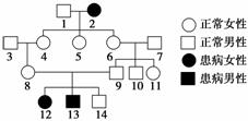 解析:8(母亲)、9(父亲)正常而12(女儿)患病,可以确定该病是常染色体隐性遗传病。2为患者,6的基因型一定为Aa;7的基因型可能为AA或Aa,所以10为杂合子的几率不一定为1/2(当7的基因型为AA时,10为杂合子的几率为1/2;当7的基因型为Aa时,10为杂合子的几率为2/3)。家族中14的基因型及概率为:AA占1/3,Aa占2/3,他与一患者(基因型为aa)结婚所生孩子的患病几率为2/3×1/2=1/3。