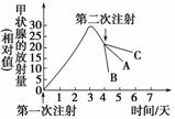 解析:本题考查碘与甲状腺激素的合成与分泌调节,碘是合成甲状腺激素的原料,进入人体手会逐渐被甲状腺吸收利用,图的纵坐标为甲状腺的放射量,第一次注射后4天的曲线先上升后下降,说明甲状腺激素合成后逐渐释放进入血液,4天后注射无放射性甲状腺激素,血液中甲状腺激素含量升高,通过反馈调节使甲状腺合成分泌,甲状腺激素的量减少,故甲状腺内的放射量下降最慢,维持较高水平,对应图中的C组曲线;若4天后注射无放射性的促甲状腺激素,会促进甲状腺激素的合成分泌,所以甲状腺内放射量下降最快,对应图中的B组曲线,A组为对照组,故本题答案应选B.