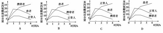 7.苯丙酮尿症是由于苯丙氨酸羟化酶的合成受阻,苯丙氨酸代谢障碍所致,患儿尿中含有大量的苯丙酮酸等代谢产物,使尿有一种特殊的鼠尿臭味。一般情况下,个体基因型为pp时表现为苯丙酮尿症,但基因型为Pp(杂合子)的个体在一定程度上也会表现出症状。医生让被检测者口服苯丙氨酸溶液,在之后的4 h内测定被检测者血浆中苯丙氨酸含量的变化情况,则下列曲线中正确的是( )