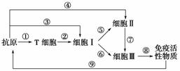 解析:细胞Ⅰ为B淋巴细胞,细胞Ⅱ为记忆细胞,它们都能识别抗原。⑨所在的阶段中没有吞噬细胞的参与;免疫效应⑦比⑥要强;由于该图表示的是体液免疫,故图中的免疫活性物质是抗体。