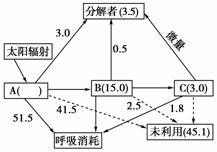 9.如下图所示为某湖泊生态系统能量流动的定量分析图解,图中A、B、C代表三个营养级,数字均为实际测得的能量数值,单位为J/(cm2·a)。已知该生态系统受到的太阳辐射总能量为118 872 J(cm2·a),但其中118 761 J(cm2·a)的能量未被利用。下列叙述不正确的是
