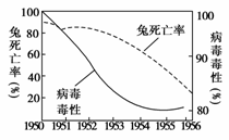 8.(2010年淮安调研)1950年,为除去对农作物构成重大危害的兔,澳洲使用了能引起兔致命疾病的病毒。如下图所示是对此后6年间兔的致死率和病毒的毒性变化进行调查的结果。生物学家从以上结果中得知一个事实,即兔因发生遗传性的变异而对病毒产生抗性;病毒也因遗传的变异而毒性减小。兔和病毒进化的主要原因是