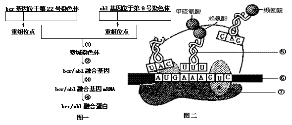 Ⅱ.在正常人体细胞中,非受体型酪氨酸蛋白结合酶基因abl位于9号染色体上,表达量极低,不会诱发癌变。在慢性骨髓瘤病人细胞中,该基因却被转移到第22号染色体上,与bcr基因相融合。发生重排后基因内部结构不受影响,但表达量大为提高,导致细胞分裂失控,发生癌变。下图一表示这种细胞癌变的机理,图二表示基因表达的某一环节,据图回答: