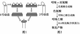 4. 赤霉素广泛存在于高等植物体内,它可以通过提高生长素(吲哚乙酸)的含量间接促进植物生长。为验证这一结论,实验小组设计了如图1所示的实验方法,图2是生长素合成与分解的过程示意图。