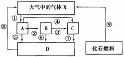 5、下图所示为生物圈中的部分物质循环,A、B、C、D构成生物群落,箭头①-⑨表示循环过程。下列叙述不正确的是