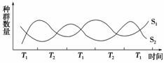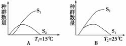 解析:(1)A图和B图都表现出“你死我活”的竞争曲线关系,由A图知在T1=15℃时,S1在竞争中获胜。在T2=25℃时,S2在竞争中获胜。若T1和T2交替变化时,它们的关系仍符合竞争曲线。