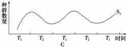②如果环境温度是不稳定的,在一定频率下发生T1、T2的交替变化,S1种群数量随时间的变化如C图,S2种群数量变化将会怎样?试在C图的坐标中表示出来。