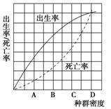 (2)科研人员对海洋中的某种食用生物进行研究,得出了与种群密度相关的出生率和死亡率的变化,如图所示。分析下图,回答问题: