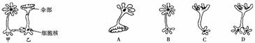 9.(2010·广东阳江摸底)一同学将下图乙伞藻的细胞核与伞部去掉,并将甲伞藻的细胞核移入乙中,则存活下来的乙伞藻其外形是( )