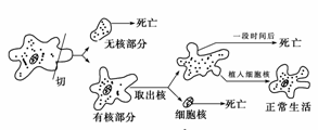 14.如下图用一根玻璃针将一个变形虫切成两半,有核的一半能继续生活,无核的一半死亡。如果将一个变形虫的核取出,无核部分能短期生存,但不能繁殖后代,单独的细胞核则无法生存。如果在去核后三天,再植回一个细胞核,这个变形虫则生活正常。