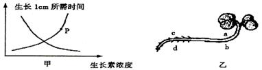15.(09耀华中学高三测试)将植物横放,测量根和茎生长素浓度与其生长状况的关系如甲图所示。则曲线上P点最可能对应于乙图中的位置是 ( )