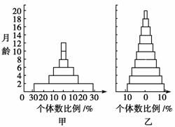 (3)调查甲、乙两草原所捕获鼠的月龄,它们的月龄构成如下图。据图分析: 草