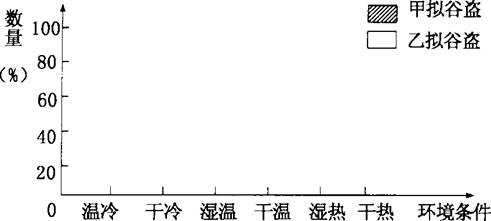 (1)根据上表数据,在下面提供的坐标中绘制湿冷、干温条件下两种拟谷盗数量百分比的柱形图。 ‘