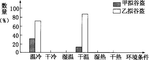 (1)根据表中提供的湿冷和干温两种条件下两种拟谷盗所占数量百分比可画出柱形图。注意题目的要求:一是柱形图;二是阴影表示甲拟谷盗,空白表示乙拟谷盗。