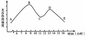 (2)对于C点光合作用强度减弱的解释是:由于中午______过高,_______作用过大,叶片的气孔关闭,使光合作用原料之一的______供应大量减少,以致_________反应阶段植物体内的五碳化合物不能与之结合,使__________的形成大为减少。