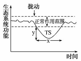 9.(2011·海南模拟)如图所示,两条虚线之间的部分表示生态系统功能正常的作用范围。y表示一个外来干扰使之偏离这一范围的大小;x表示恢复到原状态所需的时间;曲线与正常范围之间所夹的面积可以作为总稳定性的定量指标(TS)。下列说法正确的是( )