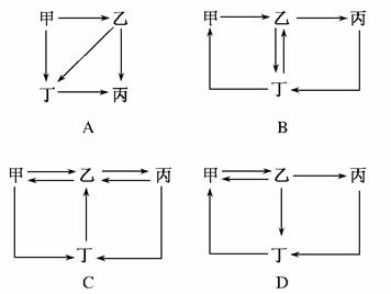 13.(2010·辽宁大连)若甲代表大气中的SO2,乙代表生产者,丙代表消费者,丁代表分解者。则甲、乙、丙、丁在硫循环中的关系是( )