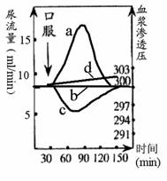 B.当饮入一定量的等渗盐水后,血浆渗透压基本不变,代表尿流量变化的曲线是d