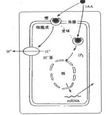 31.(7分)生长素作用的机理是促进细胞生长,生长素所诱导的生长既有快速反应:生长素→质膜上的受体→H+分泌到细胞壁中→细胞壁软化→细胞膨压下降→细胞吸水→快速反应;又有长期效应:生长素→细胞质中的受体→信使物进入核内→使某些基因解阻遏,与生长有关的mRNA被转录→蛋白质合成→长期效应。因此有人提出了生长素促进植物生长的作用方式设想(如图)。请回答问题: