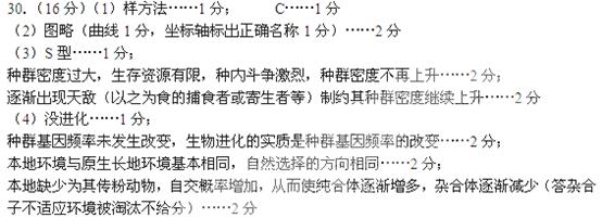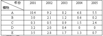 30.(2011浙江四校联合体检测)(16分)外来物种入侵,会对当地群落结构和生物多样性产生影响,某市农林部门的科研人员在郊区一块长期弃耕农田中,对某种菊科的入侵植物和本地的几种菊科植物的种群密度进行了连续五年的调查,所得结果如表所示(单位:株/m2)。
