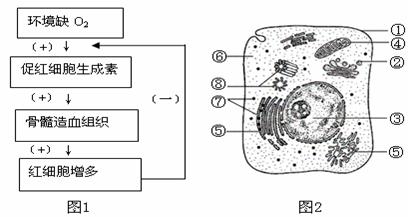 31. (2011烟台高三诊断)(9分)兴奋剂是国际体育界对所有违禁药物的总称,包含种类很多,常用兴奋剂有雄激素及其衍生物、促红细胞生成素(EPO)等。EPO作为一种糖蛋白激素,能够刺激骨髓造血功能,机理如图1所示,图2是人体细胞模式图。请回答下列相关问题:
