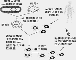 32.(2011福建福州检测)重症联合免疫缺陷病(简称SCID)是代表一组体液和细胞免疫严重缺陷的综合征。患者先天腺苷酸脱氨酶(ada)基因缺乏,不能抵抗任何微生物的感染,只能在无菌条件下生活。运用现代生物技术进行治疗,可以使患者的免疫功能得到很大的修复。下图表示治疗SCID的过程,据图回答下列问题: