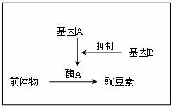 ⑸进一步研究得知,基因A是通过控制酶A的 合成来催化一种前体物转化为豌豆素的。而基因B-b本身并不直接表达性状,但基因B能抑制基因A的表达。请在右侧方框内尝试用概念图(文字加箭头的形式)的方式解释上述遗传现象。