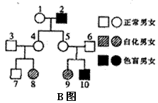 (3)B图是某家族遗传系谱(色觉正常基因为B,红绿色盲基因为b,正常肤色基因为A,白化病基因为a)。4号个体的基因型为________________。8号个体的基因型为________________。7号个体完全不携带这两种致病基因的概率是________。