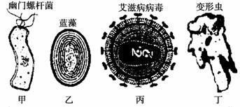[解析]本题考查了生物必修一中关于细胞结构的相关知识,细胞结构是一个考点,应该高度重视,由图可知:甲乙丙丁分别是细菌,蓝藻,病毒和原生动物,甲乙两种细胞的细胞壁的主要成分是肽聚糖,所以使用纤维素酶无法将其分解,乙是蓝藻,不是低等植物;丁细胞是原生动物,其中没有叶绿体。丙的遗传物质是单链RNA,由于是单链,其结构不稳定易产生变异。